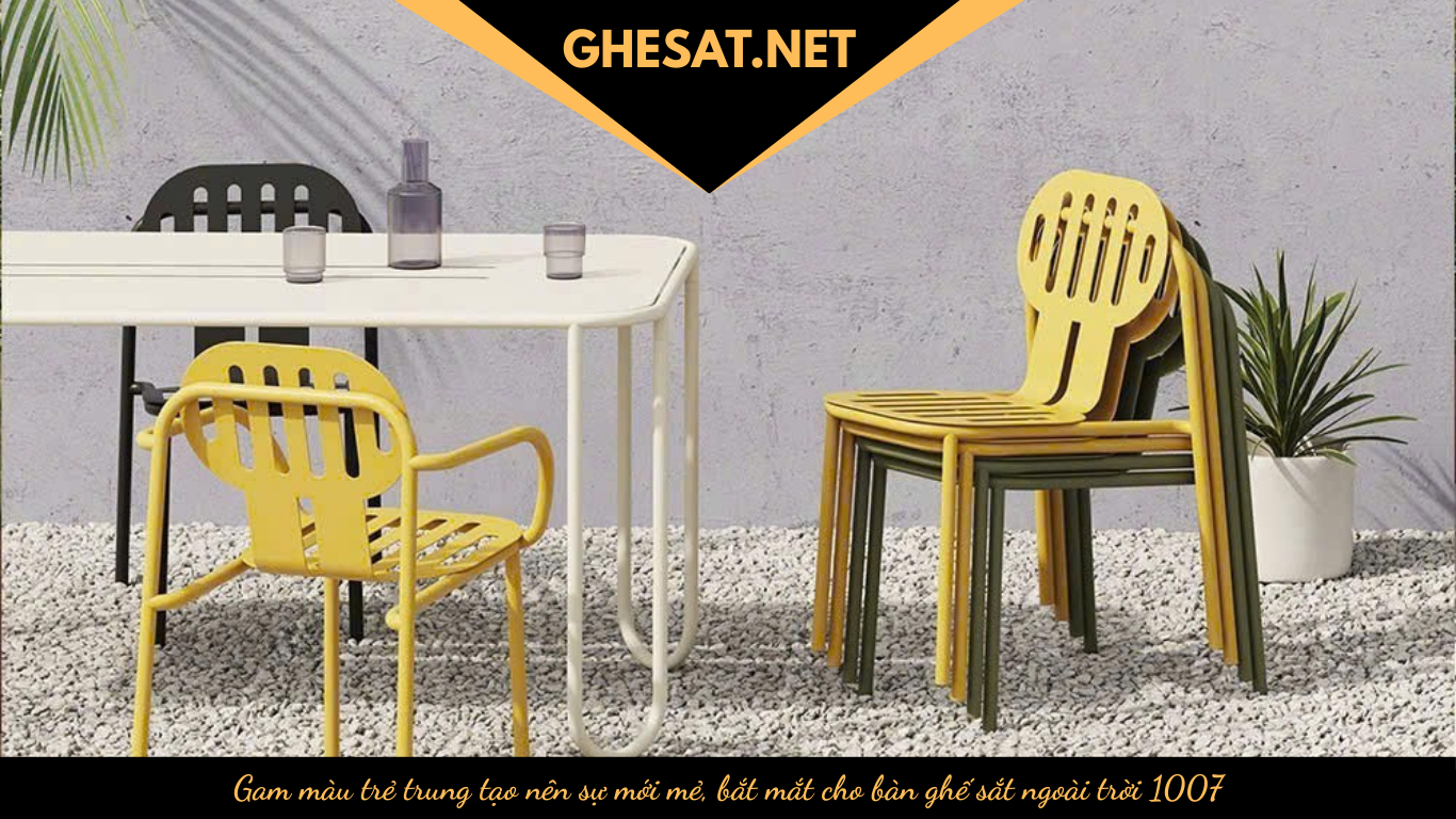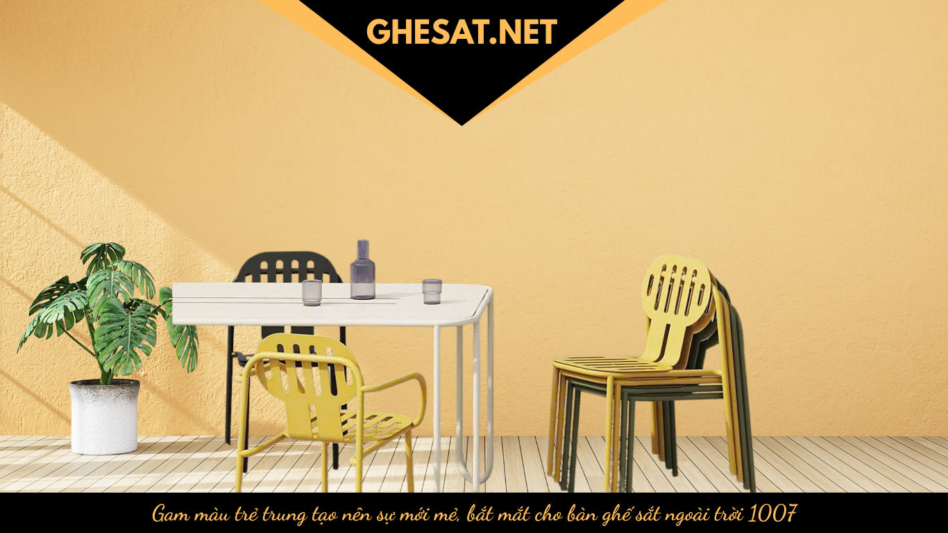 Bàn ghế sắt quán ăn 1007 không chỉ thu hút bởi kiểu dáng mà còn bởi bảng màu sắc tươi mới, trẻ trung: vàng tươi, trắng kem và xanh rêu. Màu vàng rực rỡ mang đến nguồn năng lượng tích cực, sự vui vẻ. Nên sản phẩm rất thích hợp cho những không gian cafe, quán ăn trẻ trung, năng động.