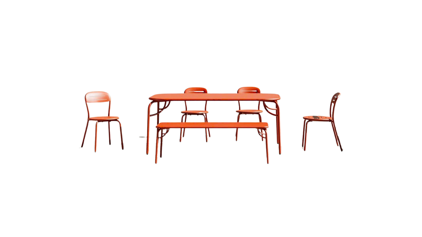 Bộ bàn ghế sắt 999 gây ấn tượng ngay từ cái nhìn đầu tiên với thiết kế đơn giản cùng đường nét tròn mềm mại nhưng cực kỳ vững chãi. Không cầu kỳ, không rườm rà, sản phẩm theo đuổi phong cách tối giản. Nhưng tổng thể bàn ghế vẫn mang lại cảm giác năng động, tươi mới nhờ gam màu đỏ cam nổi bật.