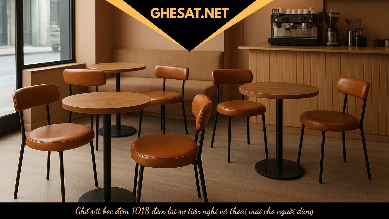 Phần đệm ghế sử dụng mút xốp cao cấp bọc da PU, vừa êm ái vừa dễ dàng vệ sinh. Nhờ đó, ghế sắt cafe 1018 là lựa chọn lý tưởng cho các quán cafe ngoài trời, sân vườn có mái che hoặc khu vực nội thất gia đình.